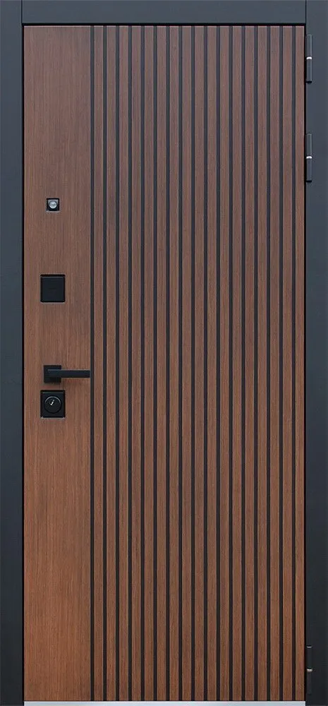 Порошковое покрытие "Муар черный". Экошпонированная дизайнерская панель МДФ 10 мм. Линейная фрезеровка. Цветовая комбинация: "дуб кантри темный", черное патинирование по фрезеровке. Наличник МДФ гладкий 80 мм., цвет "черный кварц".